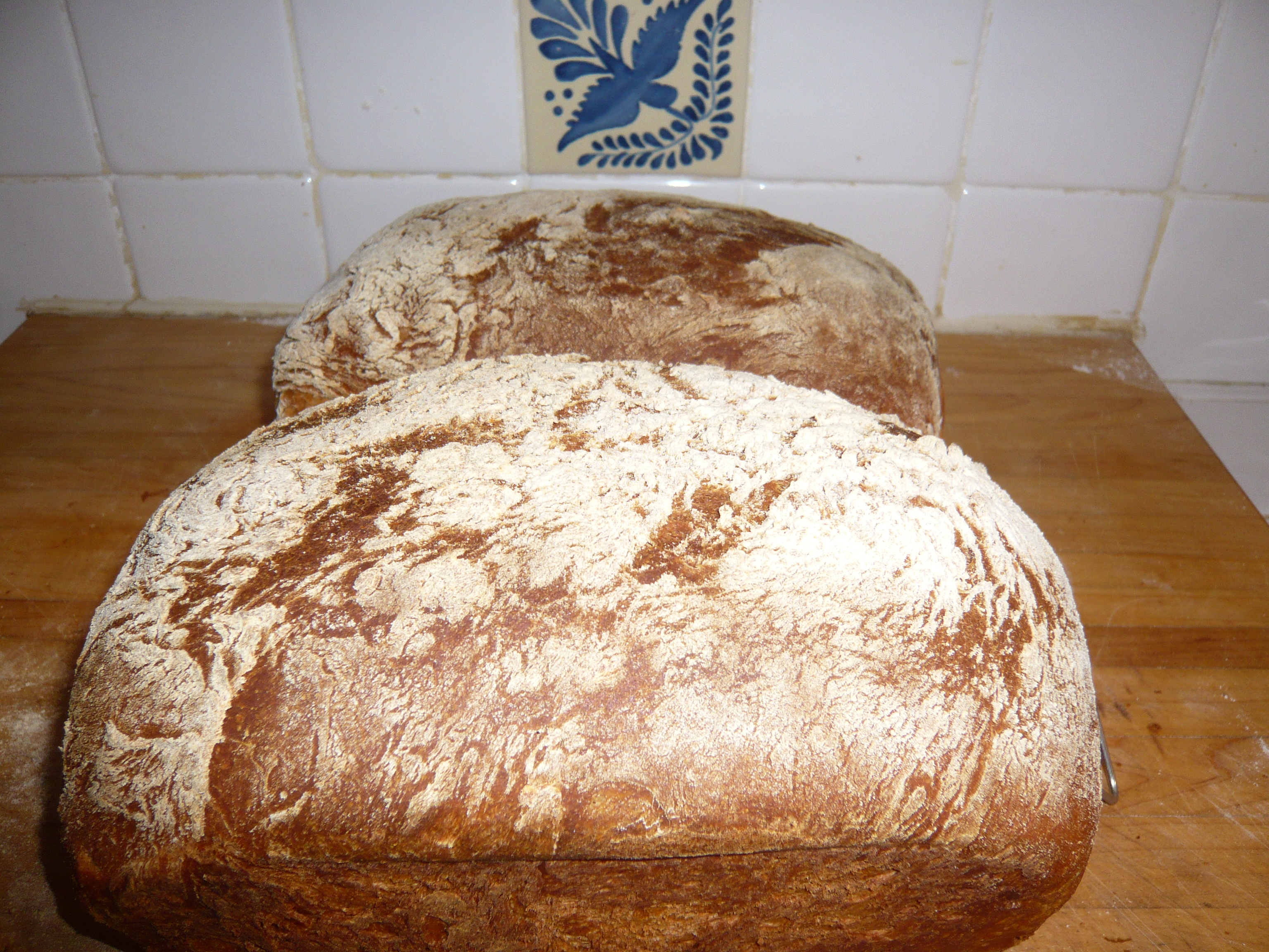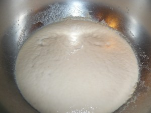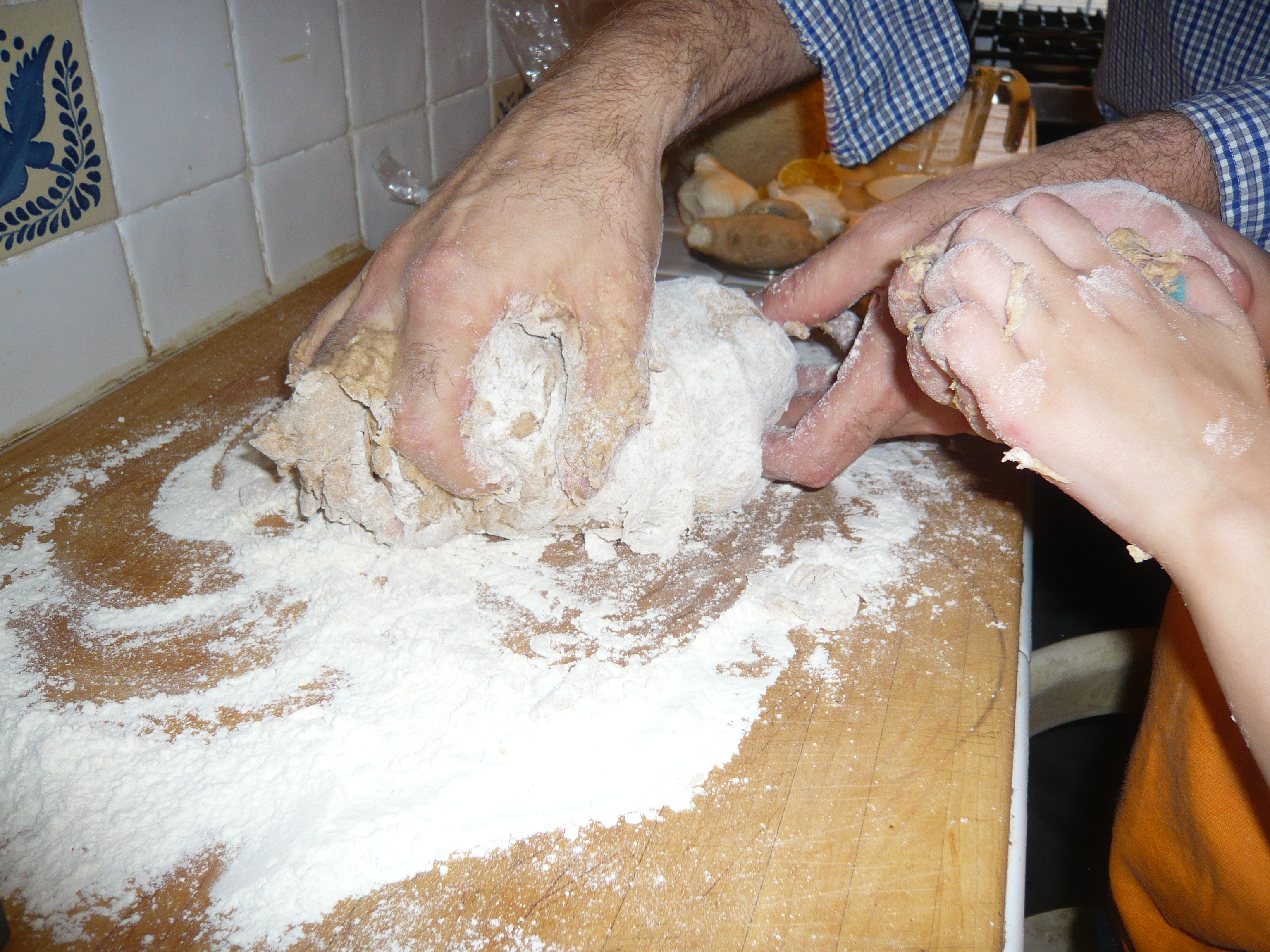 Mix in the warm milk. Stir together the whole-wheat and white flours. Make a well in the center of the flour and pour in the yeast mixture. Work the flour into the yeast, a little at a time. Beat well, turn out on a lightly floured board. Knead until smooth and elastic–at least 5 minutes.