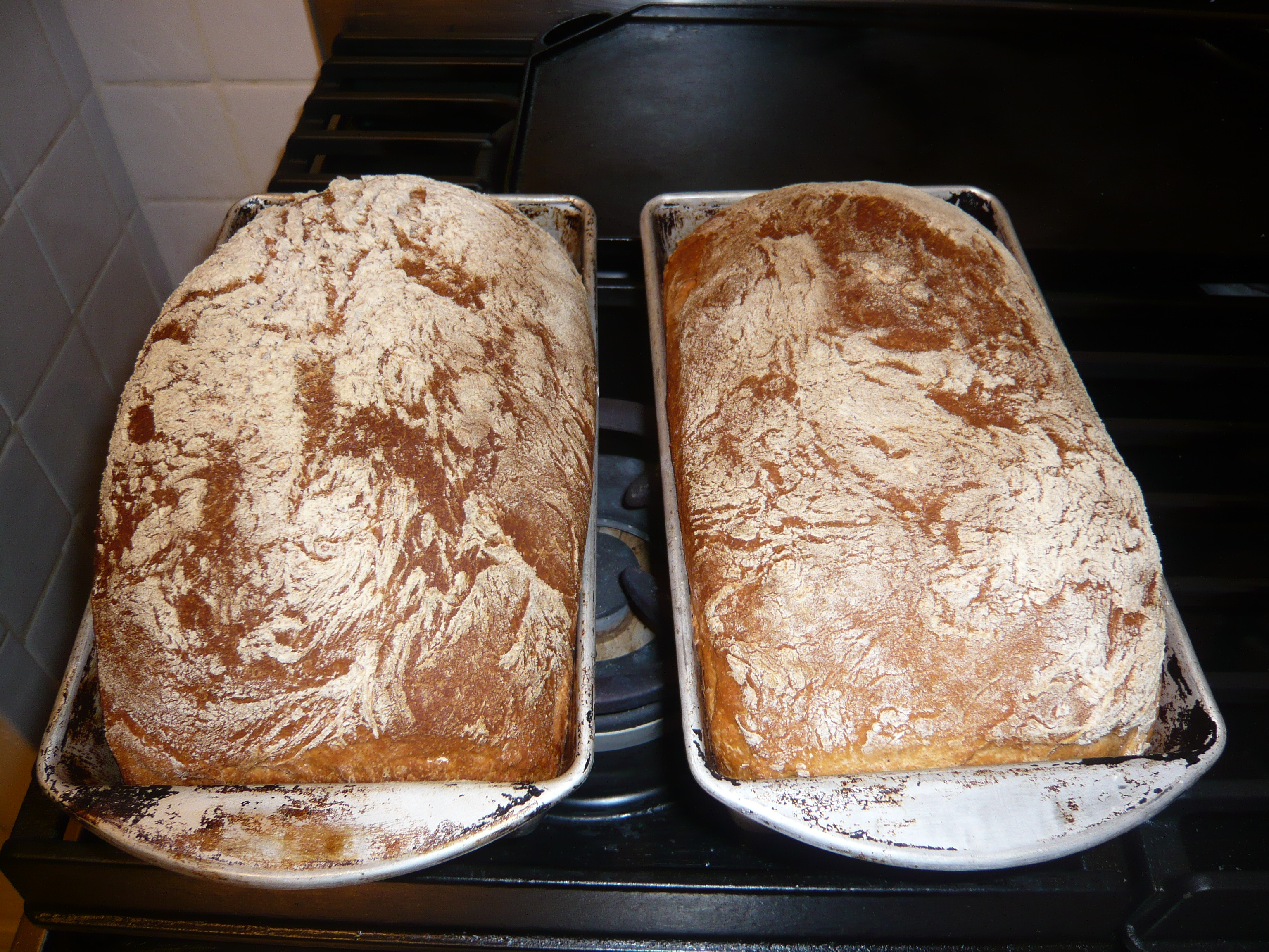 Place in a greased bowl, cover with a dish towel and let rise until doubled in bulk, over an hour. Turn out on a board and knead again for 1-2 minutes. Divide in half, and shape into loaves. Place in greased bread pans, 9x5x3 inches. Cover and let rise again until center of dough is slightly higher than the edge of the pan, about 45 minutes. Bake at 375 for 40-50 minutes. The top should be brown and the bread should sound hollow when tapped lightly with the fingers. Remove from pans immediately and cool on wire racks.