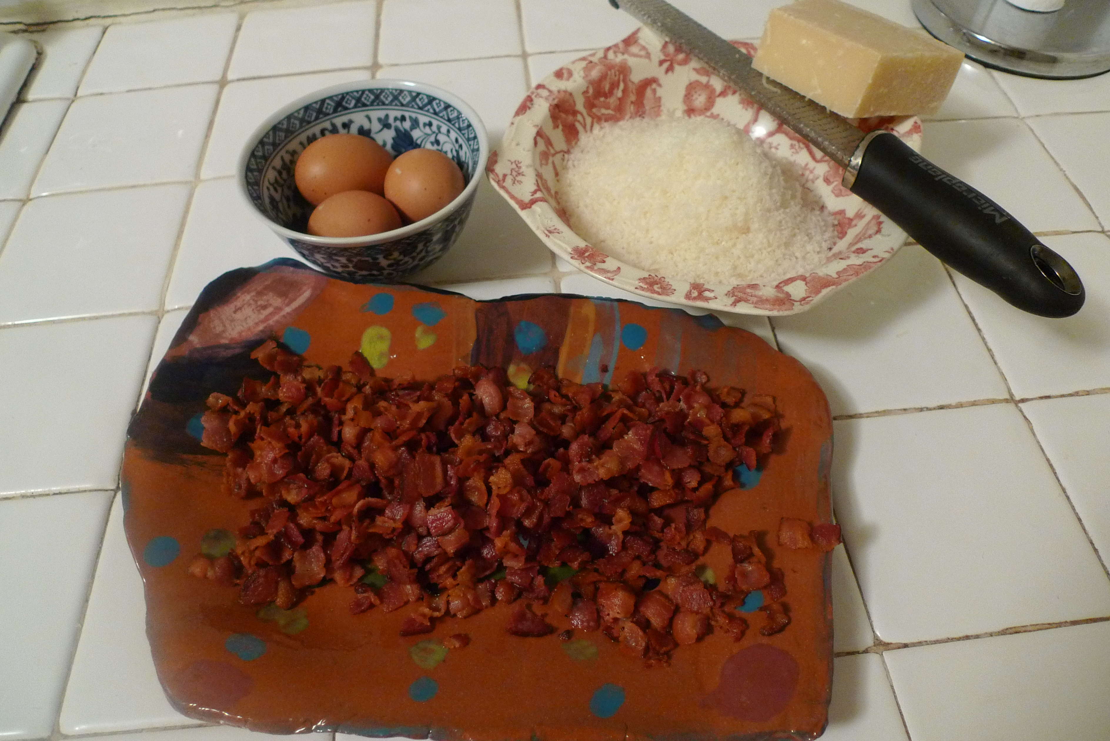 I was wondering how I’d cook the spaghetti I brought back from Faith Willinger’s class. This is it. Do you use regular bacon or do you scout out pancetta?