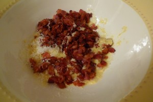 1 pound of bacon cut into 1/2 inch pieces and cooked until crisp (carbonara refers to the coal miners who invented the dish in mid-century Italy. Take apart carbon – ara and you get carbon. The bacon becomes the little bits of coal.)