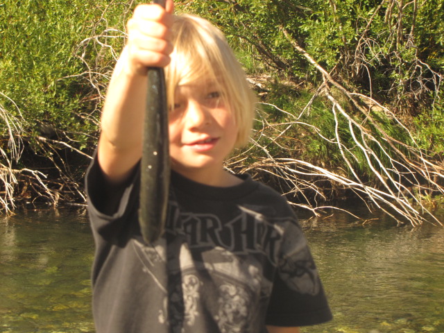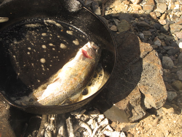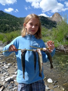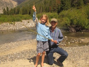 Bob Griswold, handsomest cowboy in the Sawtooth’s, cut a willow branch with a knife, tied on some line and a hook, placed a bright red salmon egg on the end of the hook and let Livia drop it in Wildhorse Creek, in a pool close to the bank. She pulled out three trout. Bob made a campfire and set up a cast iron pan at the edge of it, on some rocks. Livia, bitten, went back with her willow switch rod to catch another and she did, immediately. Alone, she wasn’t sure what to do with the fish as it flopped about on the bank. Another friend, Matt, showed her what to do, and then gave a lesson in gutting the fish. Livia cleaned her own. Others caught a river char, and Leandro McPhee, on his tenth birthday, caught the longest trout of all. On a sunny bank of a creek in a valley of the Sawtooth’s, we ate butter fried fish with lemon. I thought of my grandmother 100 years ago, a six year old, in Montana, in the wilderness, fishing with nothing more than a switch, catching dinner for her mother and little sister — in what was then, for them, with no money and little food, something of a necessity.