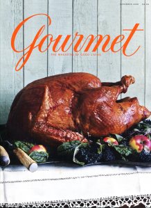 Once again I am reminded of, and thus devastated about, the loss of Gourmet. We’re off to Providence for Thanksgiving. Many McPhees collecting at my cousin’s house to cook an enormous feast. (Twenty-six of us this year.) We arrive each year armed with Gourmet and the intention to cook many of the recipes, replacing the ones that interest us less with recipes from past November issues. I have had more than a few friends ask what we will do without Gourmet. I don’t know, is the answer. The year of the Persian-influenced Thanksgiving (I still make the jeweled rice regularly) we made every single recipe. We even bought the calla lilies used in the illustration to decorate the table. I can’t help feeling that S.I. Newhouse will come to his senses, that he’ll bring Gourmet back. It will come back. It will. In the meantime, we have this year. Off we go, ready to roll our sleeves up and cook: Bacon Smashed Potatoes, and Toasted Cornbread Pudding, and Kale With Panfried Walnuts, and Oyster Casserole, and Braised Turnip Greens With Turnips and Apples, and Brown Sugar Baked Sweet Potatoes And Acorn Squash, Cranberry Celery Relish, and Bourbon Pumpkin Pie, and this is just the beginning. My splendid, gracious cousin, her welcoming family, her parents, my parents (both sets divorced), our stepmothers, in-laws, a few of my many lovely sisters, all the children, even my cat—all of us in the kitchen, inspired by Gourmet: stirring, whipping, melting, rolling, stuffing, carving. Happy Thanksgiving.