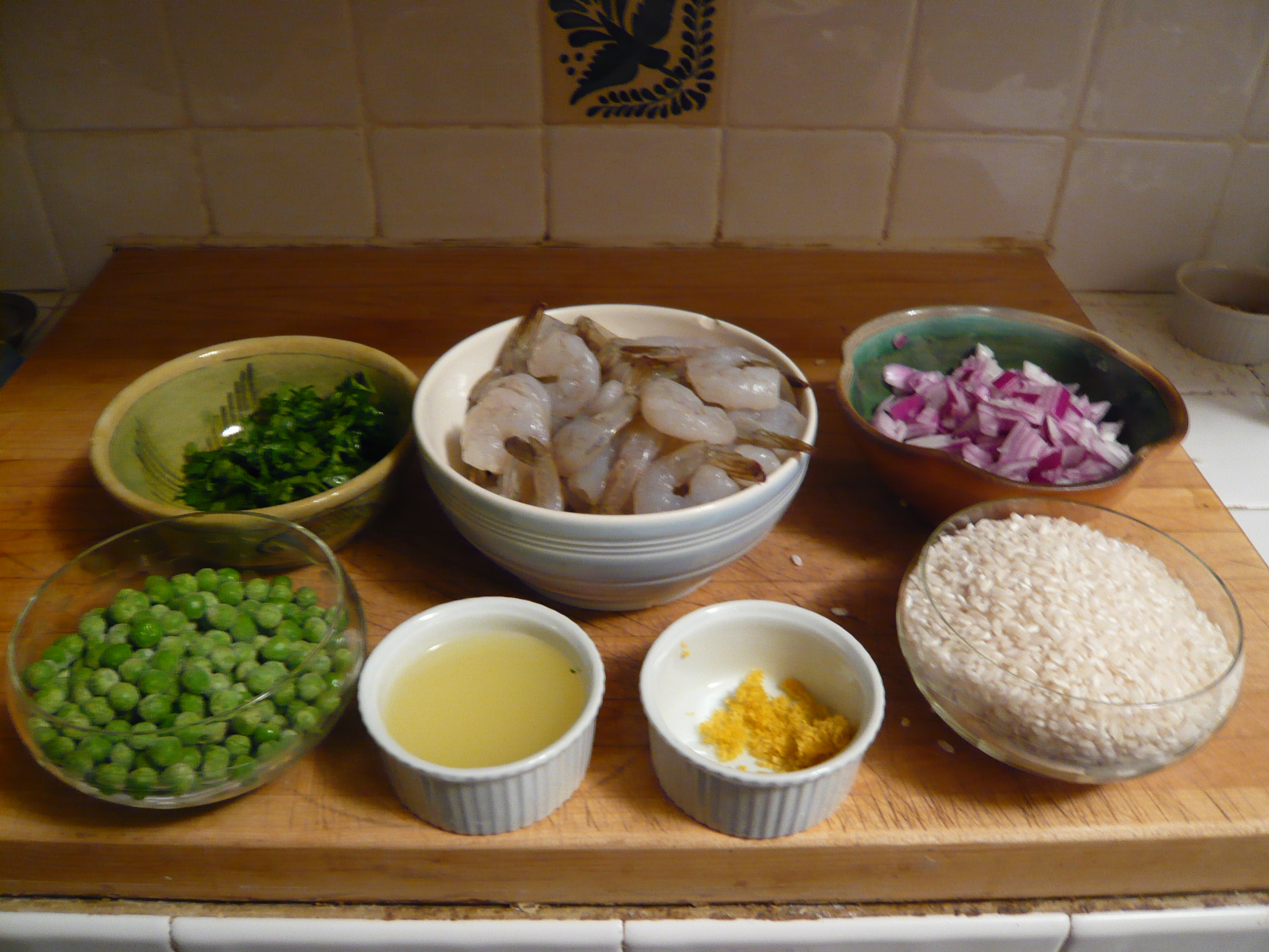 In a heavy pot heat olive oil, add onion, cook about 3-5 minutes until translucent.  Add rice, coat with oil and onion.  Add wine.  Let absorb a little.  Add an ample laddle of stock, stir constantly.  Before all the stock is absorbed add another laddle of stock.  Stir.  Repeat.  REMEMBER always keep the rice wet.  Don’t let the stock vanish.  This should take about 15-20 minutes.  When the rice is al dente, add a second to last laddle of stock.  While stirring it in add the peas and the shrimp, lemon zest and lemon juice.  Stir until the shrimp turn pink and curl.  About 2-3 minutes.  Add a final laddle of stock.  The risotto should look almost soupy.  Stir in the parsely.  Transfer to a platter and serve.